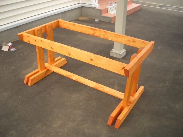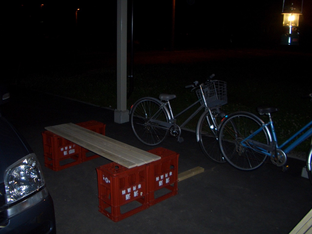 今日は一気に完成まで記します。 作業2日目 ヤフーオークションで「インウッド」を落札しました。 アウトレット扱いなので、通常より約1,000円安く手に入れることが出来ました 今回購入したのは「シダー」という色です。 翌日が仕事休みだったので朝一番から組み立て作業をするために、仕事が終わって夜9時過ぎから塗装を始めました。 しばらく使っていなかったコールマンのランタンを灯しての作業です。 前回の階段製作の時と同様に、雑巾がけの要領で塗装していきます。 なんとか塗り終えることが出来ました。 インウッドは伸びも良くてとても塗りやすいです。ただ缶の形状が悪く、100均で買ってきたミニバケツに塗料を移す際に、けっこうこぼしてしまいました。あ~もったいない 作業3日目 天候にも恵まれ、朝から組み立て作業に入ります。 まず簡単なベンチから作り始め、あっという間に(でもないか)完成。 引き続き、BBQテーブルの組み立てをします。 組み立てる順番は、自己流で考えながらやったので、正しいかは分かりません。 まず、天板を受ける枠を組み立てます。本当は水平をとって作るのでしょうが、そういった面倒なことはせず、自分の勘を信じます。 続いてテーブルの脚部を組み立てました。ここも本当は垂直にしたほうが良いのでしょうが、やはり自分の目と勘を信じます。 続いて、天板を受ける枠と脚部を合体させます。しつこいようですが、ここでもやはり自分の目と勘でくっつけちゃいます。(一応メジャーで、枠の上から脚部の下の長さを測って合わせました) 続いて反対側の組み立てですが、一人で作業していたので、先に脚の補強材を組み立ててから、ひっくり返します。これで自立してくれるので一人でも作業出来ます。 もう片方の脚部を取り付け、立ててみるとこのようになりました。アスファルトも水平ではないのですが、ガタつきも無いようで、なかなかイイ感じです。 この後、天板を張る前に枠の中に2本根太(とは言わない?)をつけます。 根太を取り付けたら、天板を張っていきます。 (この間の写真は撮り忘れました) ひっくり返してBBQコンロを受ける台を取り付けます。この部分は設計図は書いてませんが、実際のコンロの深さを測り、端材を使って即興で作りました。取り外し可能なフタの部分も組み立てておきます。フタをしたとき、木の位置と順番が合うように別に組み立てておきます。 という訳でBBQテーブルの完成です コンロを入れると、こんな感じになります。 さっそく完成記念に、夕飯は家族で焼肉です。 そしてBBQテーブルは大活躍 だったのですが・・・・ 完成当日の夜には、このような姿になってしまいました コゲちゃいました。 まっ、いっか 丸焼けになった訳じゃないし 最後まで、ご覧頂きありがとうございます。 更新の励みになります できたら、こちらもポチッとお願いします