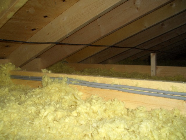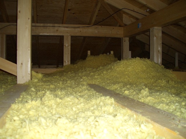 ウチの屋根には、ドッカリと雪が積もっています。 周りの家と比較しても、その量がとても多いのです。 断熱がしっかりしているからなのか?と思い、ちょっと調べてみました。 屋根の断熱には大きく分けて「屋根断熱」と「天井断熱」がありますが、ウチの場合は「天井断熱」です。 ※その他にも「桁上断熱(けたうえだんねつ)」という方法もあります。 それぞれの特徴としては、簡単ですが以下のような事が挙げられます。 「屋根断熱」 ・小屋裏をロフトや屋根裏部屋として利用できる。 ・勾配天井など、デザインに変化を変化をつけられる。 ・施工が難しく、コストもかかる。 ・空間が増える分、冷暖房コストがかかる。 「天井断熱」 ・断熱の施工がやり易く、工事コストが低い。 ・冷暖房が必要な空間が少ない。 いろいろ見ると、屋根断熱の方が良いとの意見もあったりしますが、小屋裏を部屋として活用したいとか、勾配天井等のこだわりが無ければ、施工のし易さやランニングコストの点から見て、「天井断熱」が良いのではないかと個人的には思います。 ウチの天井断熱ですが、ブローイング300mmとなっています。が実は一度も見たことがありません。 というわけで、ウチの小屋裏がどんなことになっているのか見てみました。 2階ウォークインクローゼット内にある天井の点検口を開けてみます。 まずは木ネジをはずして、点検口のフタをはずすと、そこには点検口の形にカットされた100mm厚のグラスウールが3枚つめられていました。 グラスウールを取り除き、タンスによじ登って点検口に身体を入れるとようやく小屋裏が見えました。といっても真っ暗でしたが。 小屋裏は室内とは全く違い、当たり前ですが外の気温でした。 懐中電灯を持ってきて中を照らしてみると、こんな様子でした。 ちょっと方向を変えて、もう一枚。 ちょうど寝室のダウンライトのあたりが、もっこりとしています。 吹き込まれた、グラスウール(だと思います)を触ってみると、外壁に吹き込んだものよりも、フワッフワに柔らかいものでした。 初めて、小屋裏を覗き十分満足したので、また慎重にグラスウールを隙間のないように詰め込み、点検口のフタを閉めました。たぶん何か起こらない限り、二度とあけることは無いのでしょう。 ここで最初の話に戻ります。 なぜウチの屋根には、ご近所さんの家と比較して、たくさんの雪が残っているのか? 屋根の断熱について調べましたが、ご近所さんもここ数年の間に建築された方がほとんどなので、「屋根断熱」にしろ「天井断熱」にしろ、そんなに性能的に変わるとは思えません。 ではなぜ? あっ!屋根材!? ウチは塗替え等のランニングコストを抑えるため、オークリッジプロというグラスファイバーシングルの屋根材を使っています。これが雪が落ちないのです。 冬の暖かい日に屋根上の雪がとけても、屋根から雪がザーッと滑り落ちてくることがないので、ずっと残っていたんです。 な~んだ、それだけの話だったのか 最後まで、ご覧頂きありがとうございます。 更新の励みになります できたら、こちらもポチッとお願いします