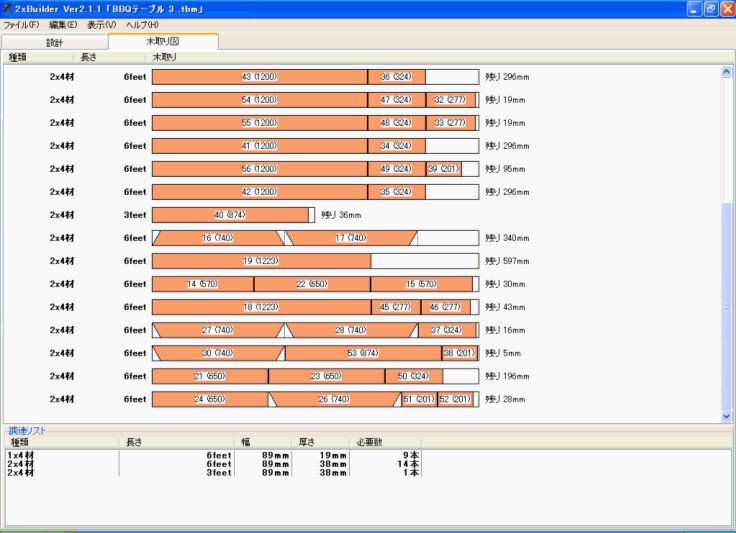 奇跡の2日連続更新です カビが発生しました しかもかなり広範囲にわたって といっても家ではなく、BBQテーブルの話です。 被害者のBBQテーブル カビの発生箇所は、テーブルの天板とベンチの座面。 上向きの面に全面的に発生。 今日は久しぶりに仕事が休みなので、早朝より修復作業を行いました。 まずは、電動サンダーで表面を削り取ります。 その後、インウッドで再塗装。今回はちょっとタップリ目に塗りました。 でも、テーブルより先に作った階段は全くカビが出てないのに、なぜカビたんだろう? 材料は同じホームセンターのSPF。 塗料は階段は「キシラデコール」、テーブル&ベンチは「インウッド」 どちらも定評のある塗料です。 よ~く考えてみると、階段は三度塗りしたのですが テーブルは横着して一度塗りしかしていませんでした 明日も休みなので、今回はもう一度塗装することにします。 BBQテーブルの話をしたついでに 最近、「バーベキューテーブル」、「DIY」といったキーワードで検索して このブログを訪れる方が増えているようです。 私のDIYなど、あまり参考にならないので申し訳なく思っておりますが なにかの参考になればということで、我が家のバーベキューテーブルの 設計図を置いておこうと思います。 ただし、この設計図は「2×builder」というソフト(シェアウェア)が必要です。 「日曜大工支援3D設計ソフト 2xBuilder」のページ 設計図の画面 私の設計図を使うのに、特に何の制限もありませんが 参考程度に考えてくださいね。 サイズなどもビミョーにミスがあるので、製作しながらの調整が必要です。 またコンロの受けの部分は設計図にはありません。 私も即興で作ったので、皆さんなりの工夫をしてみてください。 右クリックで、「対象をファイルに保存」してください。 我が家のBBQテーブル設計図(603df499.tbm) 最後まで、ご覧頂きありがとうございます。 更新の励みになります できたら、こちらもポチッとお願いします