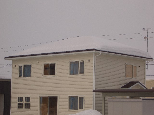 ウチの屋根には、ドッカリと雪が積もっています。 周りの家と比較しても、その量がとても多いのです。 断熱がしっかりしているからなのか?と思い、ちょっと調べてみました。 屋根の断熱には大きく分けて「屋根断熱」と「天井断熱」がありますが、ウチの場合は「天井断熱」です。 ※その他にも「桁上断熱(けたうえだんねつ)」という方法もあります。 それぞれの特徴としては、簡単ですが以下のような事が挙げられます。 「屋根断熱」 ・小屋裏をロフトや屋根裏部屋として利用できる。 ・勾配天井など、デザインに変化を変化をつけられる。 ・施工が難しく、コストもかかる。 ・空間が増える分、冷暖房コストがかかる。 「天井断熱」 ・断熱の施工がやり易く、工事コストが低い。 ・冷暖房が必要な空間が少ない。 いろいろ見ると、屋根断熱の方が良いとの意見もあったりしますが、小屋裏を部屋として活用したいとか、勾配天井等のこだわりが無ければ、施工のし易さやランニングコストの点から見て、「天井断熱」が良いのではないかと個人的には思います。 ウチの天井断熱ですが、ブローイング300mmとなっています。が実は一度も見たことがありません。 というわけで、ウチの小屋裏がどんなことになっているのか見てみました。 2階ウォークインクローゼット内にある天井の点検口を開けてみます。 まずは木ネジをはずして、点検口のフタをはずすと、そこには点検口の形にカットされた100mm厚のグラスウールが3枚つめられていました。 グラスウールを取り除き、タンスによじ登って点検口に身体を入れるとようやく小屋裏が見えました。といっても真っ暗でしたが。 小屋裏は室内とは全く違い、当たり前ですが外の気温でした。 懐中電灯を持ってきて中を照らしてみると、こんな様子でした。 ちょっと方向を変えて、もう一枚。 ちょうど寝室のダウンライトのあたりが、もっこりとしています。 吹き込まれた、グラスウール(だと思います)を触ってみると、外壁に吹き込んだものよりも、フワッフワに柔らかいものでした。 初めて、小屋裏を覗き十分満足したので、また慎重にグラスウールを隙間のないように詰め込み、点検口のフタを閉めました。たぶん何か起こらない限り、二度とあけることは無いのでしょう。 ここで最初の話に戻ります。 なぜウチの屋根には、ご近所さんの家と比較して、たくさんの雪が残っているのか? 屋根の断熱について調べましたが、ご近所さんもここ数年の間に建築された方がほとんどなので、「屋根断熱」にしろ「天井断熱」にしろ、そんなに性能的に変わるとは思えません。 ではなぜ? あっ!屋根材!? ウチは塗替え等のランニングコストを抑えるため、オークリッジプロというグラスファイバーシングルの屋根材を使っています。これが雪が落ちないのです。 冬の暖かい日に屋根上の雪がとけても、屋根から雪がザーッと滑り落ちてくることがないので、ずっと残っていたんです。 な~んだ、それだけの話だったのか 最後まで、ご覧頂きありがとうございます。 更新の励みになります できたら、こちらもポチッとお願いします