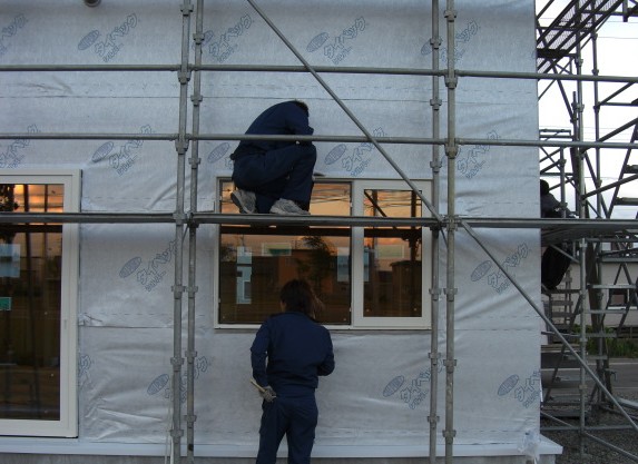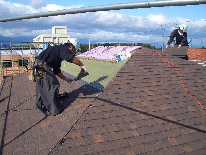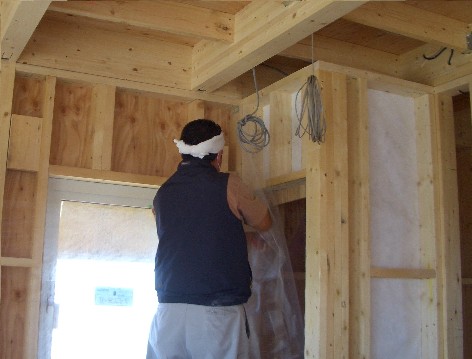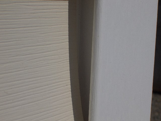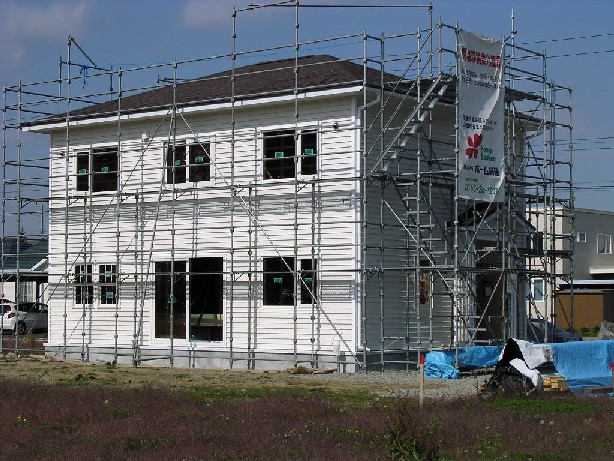 サイディングが張られました。 我が家で使われているのは、エミネンスという樹脂サイディングです。 10月4日(土) 昨日から張られ始めたサイディングはかなり進んできました。 樹脂サイディングは、アメリカ・カナダの外装材市場でのシェアが それぞれ50%、70%を占めると言われているそうです。 エミネンス樹脂サイディングの特徴(長所)としては 1.冬の凍結によってひび割れしない。塩害にも強い。 2.塗装ではないので退色しない。紫外線を防ぐコーティングで褐色の心配なし。 3.衝撃に対して割れにくい。ヘコんだりしない。 4.通常の汚れは水洗いで簡単に落ちる。 5.コーキングを使用しないオープンジョイント工法なのでメンテナンスの負担が少ない。 6.軽量なので家屋への負担も少ない。 などなどです。 欠点としては、どうやら「火に対しては強くないらしい」です。 ただ私が個人的に考える欠点は「見た目」の問題じゃないかな?と思っています。 外観的には好き嫌いが大きく分かれると思います。 実は、私達も最初は見た目は好みじゃないなぁと思っていましたし でも、今は物凄く気に入ってます 屋根材(オークリッジプロ)同様、メーカーで30年保証(条件付)もついてますし 水洗いで簡単に汚れが落ちて、コーキングの取替えが不要なので 維持管理費が少なくて済むのは、とっても大きな魅力だと思います。 (我が家の場合、換気口、換気扇周りはコーキングを施工しているので、 その部分はいずれコーキングのやり直しが必要になると思います) この辺はコーキングされています。