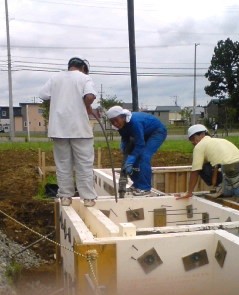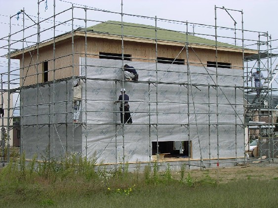 9月25日(木) さて、屋根のルーフィング、外壁の構造用合板も張り終わり 次はタイベック(透湿防水シート)張りです。 現場を見に行ってみると、なにやら見たことの無い銀色のシートが張られています。 「あれ?確かタイベックを張るはずなんだけどなぁ」と思いながら よ~く見てみると 「タイベックシルバー」と書いてありました。 なんだろコレ??? いつもなら赤と白のシートが張られているのにと思い聞いてみると タイベックに遮熱効果を持たせたものがシルバーらしいです。 ネットで検索してみると 「デュポン社の遮熱シートは従来の透湿防水シート(タイベック®ハウスラップ)にアルミを特殊技術で蒸着させ、遮熱効果を持たせた商品です。 従来の透湿・防水シート同様の施工方法で、『夏 涼しく、冬 暖かい』 住宅づくりに貢献します。」 との事。(旭・デュポン フラッシュスパン プロダクツ株式会社 ホームページより) ふむふむ。『夏 涼しく、冬 暖かい』~ いいんでないかい 聞けば、ちょうど私達の家から標準でタイベックシルバーを使うようになったそうです。 ラッキー 更新の励みになります できたら、こちらもポチッとお願いします