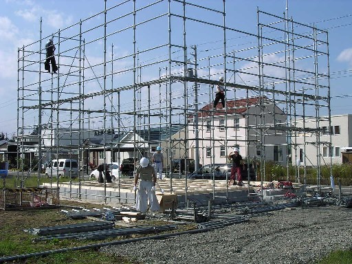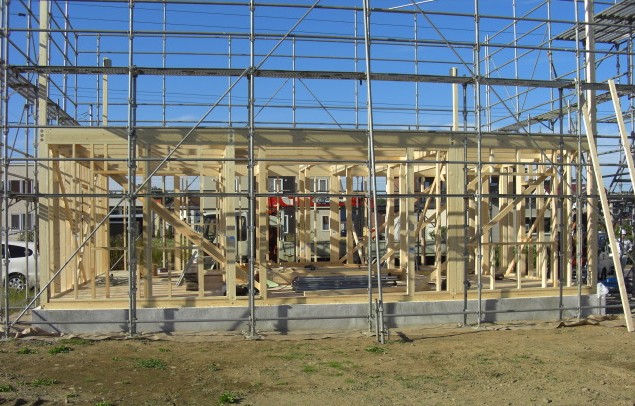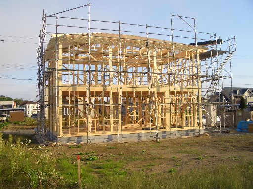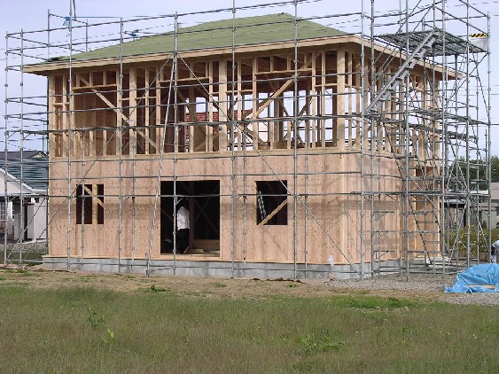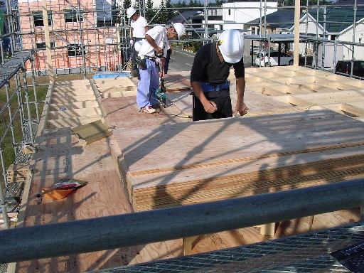 大工工事が始まって、日々どんどん形が変わっていくので 毎日でも様子を見に行きたいのですが 仕事が忙しいのと、ちょっと距離があるので毎日見にいけず残念です なので、担当してくださっているGさんが送ってくれる写真を交えながら 記していきます。 9月22日(月) 1階の建て込みが終わって2階床の合板張りを行っています。 後ろに見えているのは、同じく建築中のお隣さんです。 着工は我が家の方が早かったのですが、なが~い基礎の養生中に すっかり追い越されてしまいました ちなみにお隣さんは、外張り断熱のようでネオマフォームが張られていました。 暖かそうですねぇ~ 私はまだお会いしたことはありませんが 同じくらいの時期に入居となりそうなので、仲良くして頂きたいものです 9月23日(火) 2階までかなり形が出来てきました。屋根の骨組み?も出来ているようです。 9月24日(水) この日は屋根の下地合板張りのあと、ルーフィング(防水紙)張りをしました。 外壁の構造用合板も張られています。 これで少しの雨なら問題ないかな? でも屋根材と外壁がちゃんと付くまでは、良い天気が 続くことを祈っています 更新の励みになります できたら、こちらもポチッとお願いします